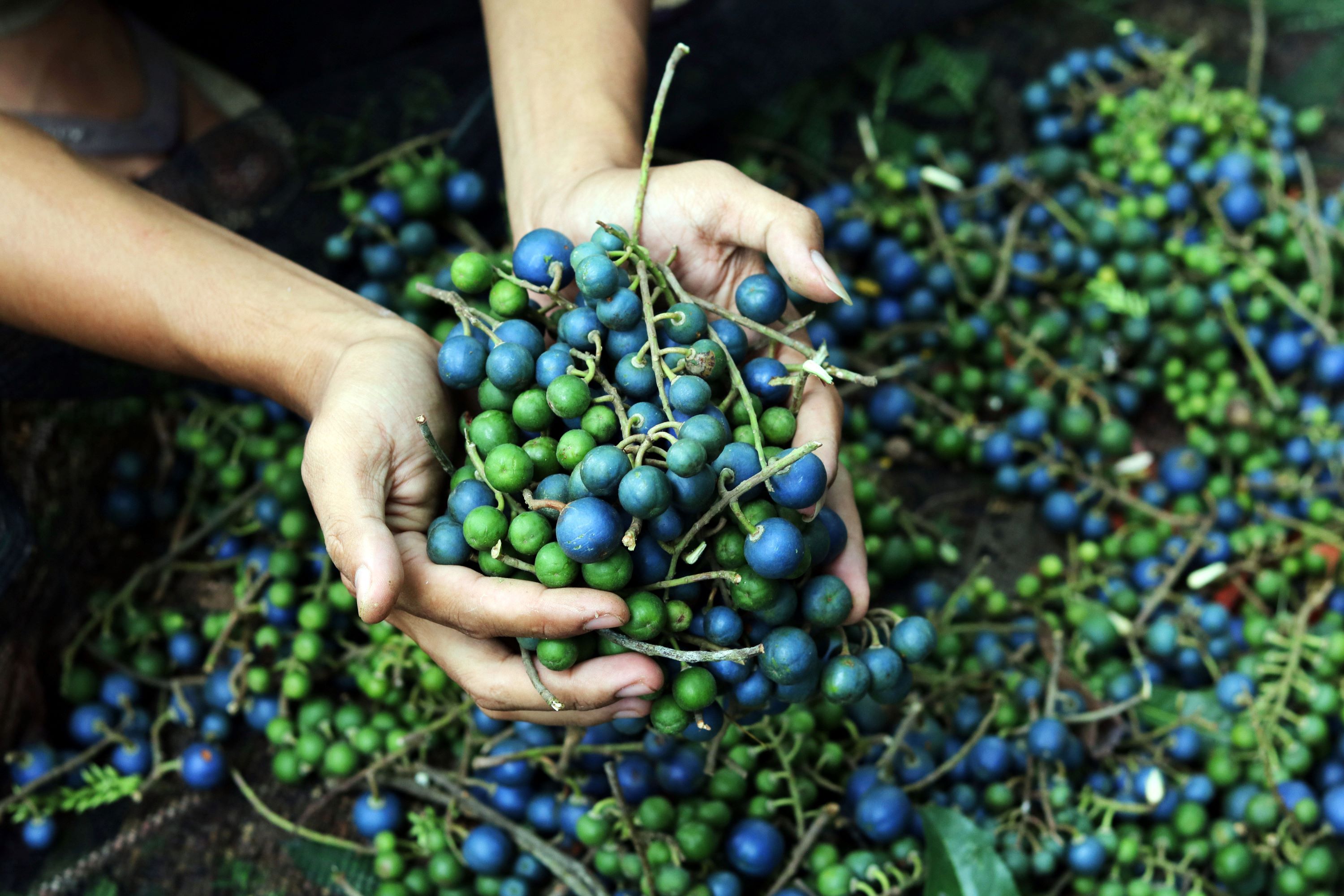 When ripe, rudraksha fruits are covered by an iridescent blue outer fruit, which gives them their other name: blueberry beads. Photo: Trees4Trees/Yulianisa Dessenita.